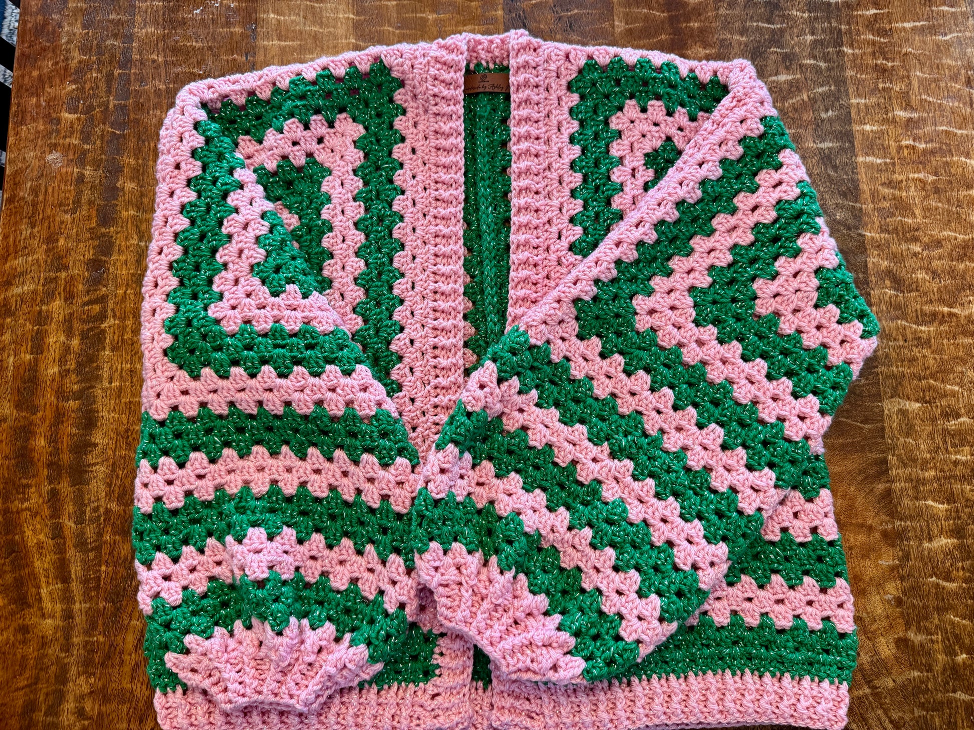 Celebrate your legacy in comfort and elegance with this handcrafted crocheted cardigan, inspired by the timeless colors of Alpha Kappa Alpha Sorority, Incorporatedยฎ. Featuring the iconic salmon pink and apple green, this piece is a warm, wearable tribute to a sisterhood of service, scholarship, and sophistication.