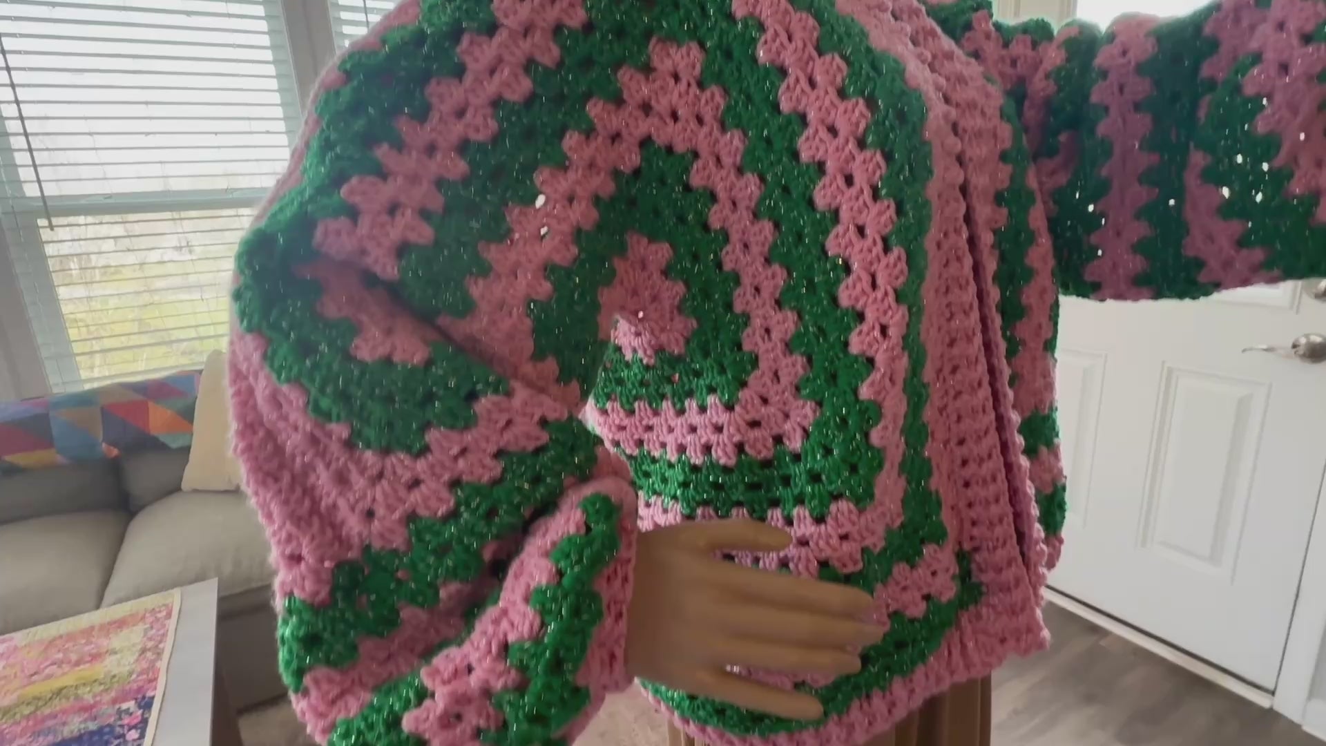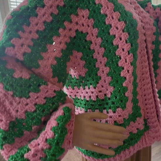 Crocheted with 97% Acrylic/3%Metallic Pink andย 97% Acrylic/3% Metallic Green Yarn.