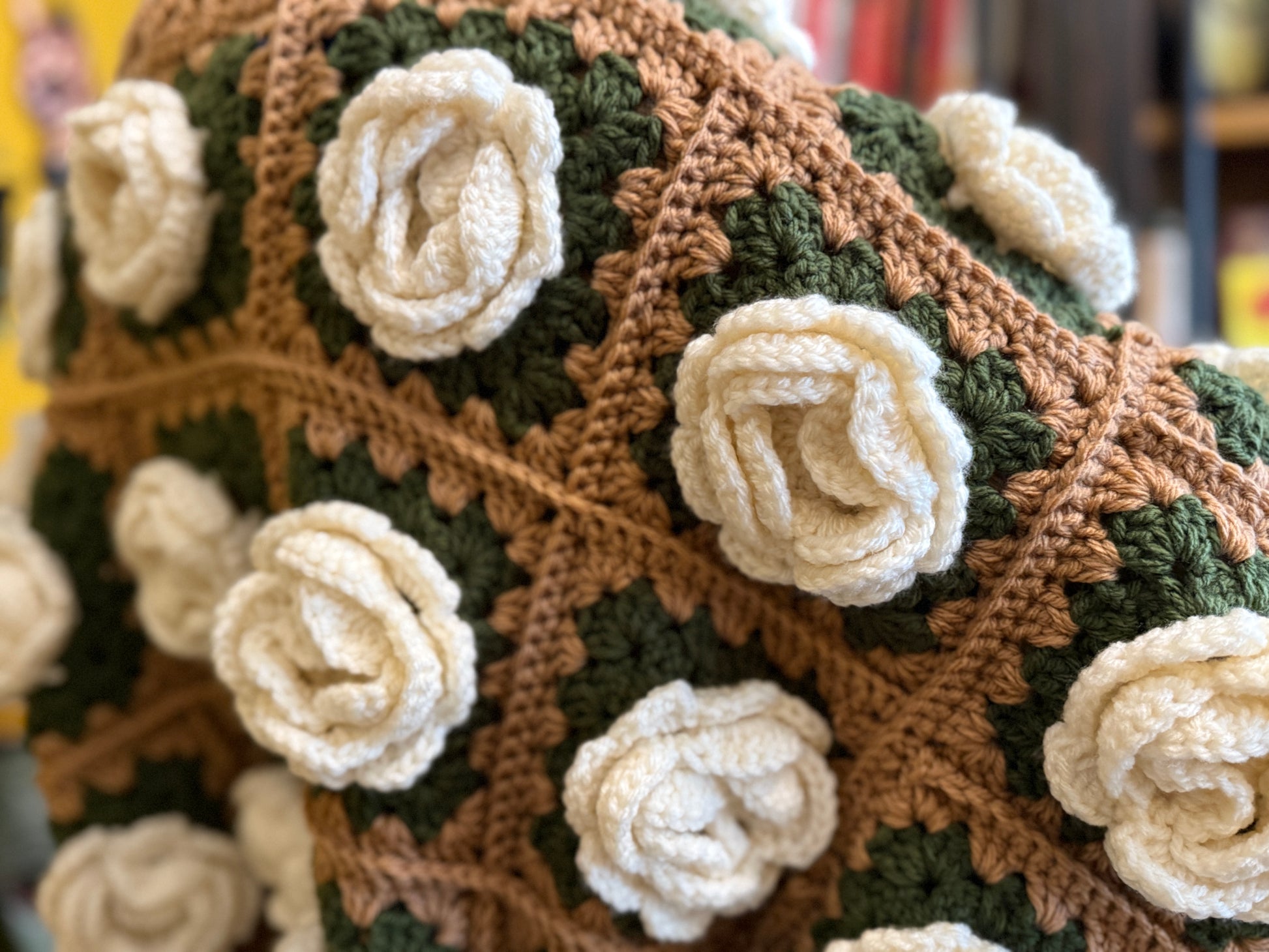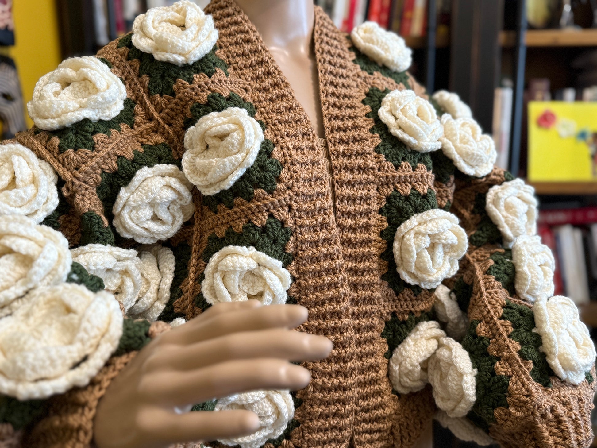 Meet your new statement layer: a hand-crocheted cardigan blooming with plush cream roses and leafy accents on a warm caramel base. The open-front silhouette and dramatic balloon sleeves give it a cozy, boho feel, while the ribbed trim adds polish. Lightweight yet snuggly, it’s perfect over dresses, denim, or lounge sets—equal parts cottagecore and city chic.